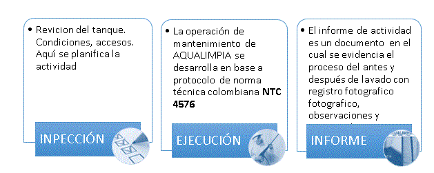 Para el caso puntual AQUALIMPIA se especializa en mejorar la calidad del agua por medio de su servicio de mantenimiento de tanques, el cual incluye entre otras limpieza y desinfección de los mismos.